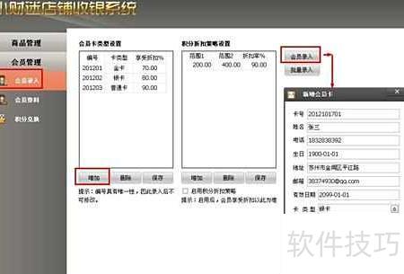 1、 打开小财迷收银系统软件专业版后台,进入会员管理模块,界面会显示会员录入、会员资料和积分兑换三项功能。首先操作会员录入功能。点击该选项后,页面弹出会员卡类型设置与积分折扣策略设置两个子窗口。在会员卡类型设置中,滚动至底部点击增加按钮,依次填写会员卡编号、卡类别及对应折扣率,完成后点击保存以确认信息。接着切换至积分折扣策略设置窗口,在左下角同样点击增加按钮,设定积分所对应的区间范围及消费折扣比例,确保积分使用规则清晰明确。两项设置完成后,系统即可支持新会员的注册与积分优惠策略的实施,为后续会员管理和营销活动打下基础。整个流程简洁直观,便于商家高效配置会员体系。