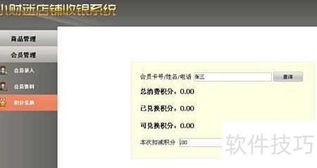 3、 第三步:在收银系统积分兑换界面,输入会员卡号、姓名或电话,查询顾客信息后,即可查看该会员的累计消费记录、已使用积分及当前可兑换积分余额。