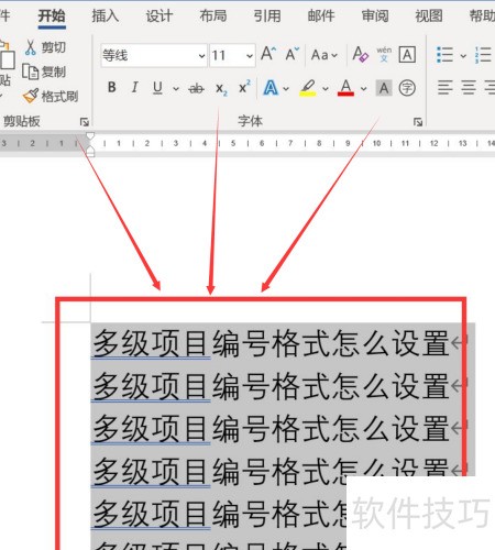 2、 打开WORD文档,选中文字后,点击开始菜单,选择多级列表编号即可完成设置。