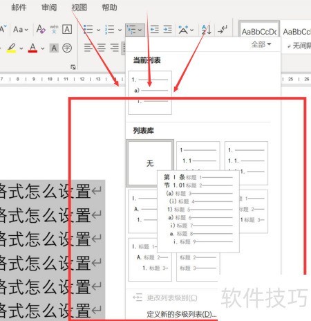 4、 第二步,从下拉菜单中选取多级列表的编号格式。