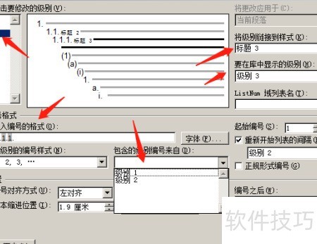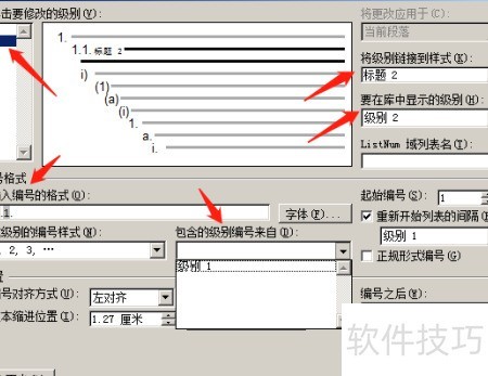 12、 可将标题1的编号插入标题2,点击包含的级别编号来自,选择级别1,标题1的编号便会显示在输入编号的格式中。