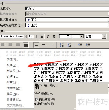 3、 按需求调整标题1的字体、段落及快捷键等格式设置。