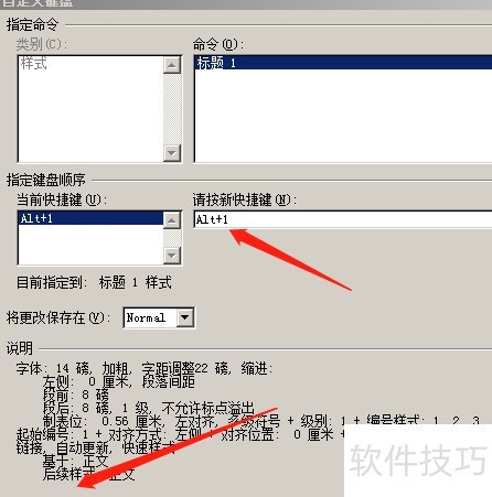 4、 为快速应用标题样式,可自定义快捷键。进入格式菜单中的快捷键设置,将标题1设定为Alt+1。此举便于操作,同时建议避开系统或软件常用组合,减少冲突可能,提升编辑效率与使用体验。