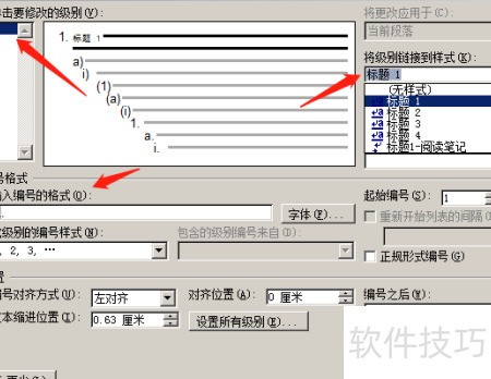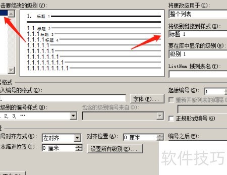 8、 选择要修改的级别中的级别1,然后在将级别链接到样式中选中标题1,接着设置要在库中显示的级别为级别1,完成设置后即可实现编号级别1与标题1的关联使用。