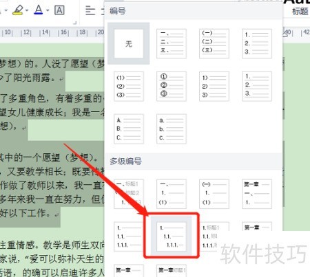 设置多级列表时,先选中所需文本,再点击多级编号中的任一样式,按步骤完成操作即可。