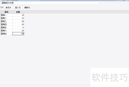 2、 在左下角创建新的内置数据集,添加星期和数量两个字段,并填入七条相应数据,所示。