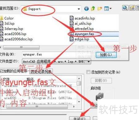 5、 在加载应用程序窗口中,找到support文件夹内的Ayunger.fas文件,选中并加载该文件,随后将其拖动至启动组内容区域完成添加。