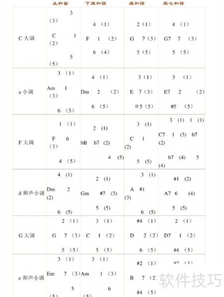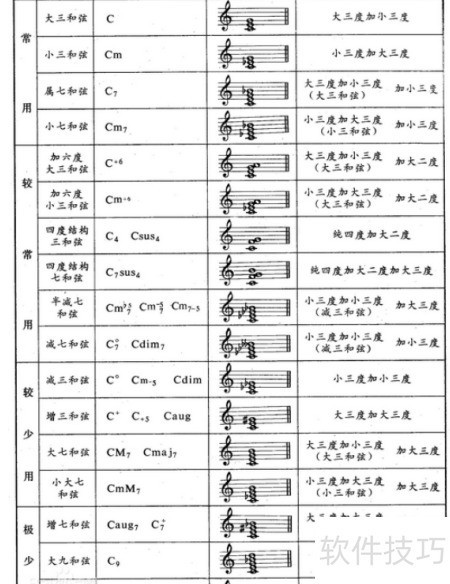 4、 小三和弦由大写字母或带升降号的大写字母后加小写m表示,其构成遵循小三度加大三度的音程关系,与属七和弦在多指弹奏法上有相似之处。