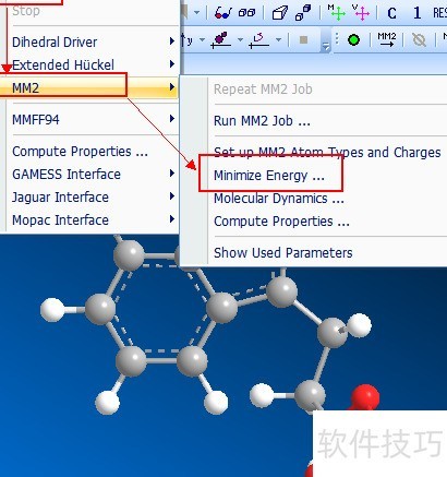 3、 在菜单栏中依次选择Calculation下的MM2,点击Minimize Energy,系统将弹出相应的参数设置对话框,等待用户进行后续操作。