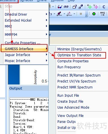 9、 在菜单栏中依次点击Calculation、GAMESS Interface,然后选择Optimize to Translation State,此时将弹出GAMESS Interface设置对话框,供后续参数配置与操作使用。