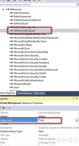 12、 将 FarPoint.Web.Spread.dll 的 CopyLocal 属性设置为 True,确保程序运行时能够正确加载该组件。