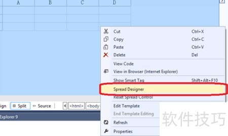1、 在WebForms窗体中打开设计器,选中Spread控件后右击,点击Spread Designer选项即可启动设计界面。