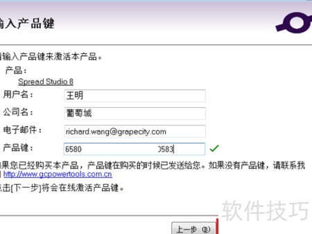 5、 请在弹出窗口中填写真实姓名、公司名称、电子邮箱及序列号,确认无误后点击下一步完成激活操作。