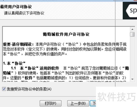 5、 在弹出窗口中勾选同意协议,然后点击下一步继续安装程序。