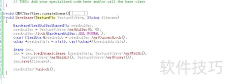 5、 在 MFCTestView.cpp 文件的 void CMFCTestView::createScene() 函数末尾,加入一行代码:SaveImage(DynamicTexture, test.png); 以实现图像保存功能。该语句将当前动态纹理内容保存为指定名称的 PNG 图像文件,便于后续查看或调试使用。