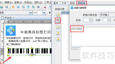 5、 点击软件左侧的实心A图标,按步骤在标签上添加文字内容。随后选择左侧的绘制一维条码工具,在画布上创建条形码。双击该条形码,进入图形属性的数据源选项,点击修改,在下方状态栏中手动输入所需信息,最后确认并完成编辑操作。