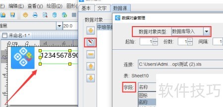 2、 在软件左侧点击插入位图图片按钮,于画布上创建位图对象。双击该位图,进入图形属性的数据源设置,点击+号,选择数据库导入类型,从字段列表中选取所需字段,确认后完成添加操作。