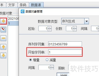 6、 点击+号选择序列生成,起始字符串设为1,再点击编辑即可。