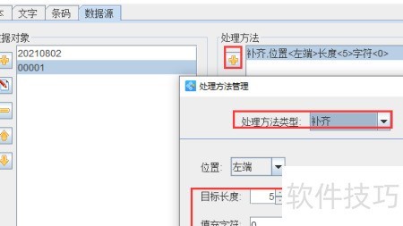 7、 点击右侧+按钮,选择补齐类型,设定目标长度为5,填充字符为0,最后点击编辑并确认完成设置。
