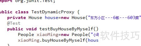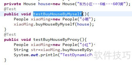 11、 创建测试类TestDynamicProxy,编写测试方法,声明一个名为小明的People对象和一个house房屋对象,随后让小明调用buyHouseByMyself方法,完成自行购房的操作流程。