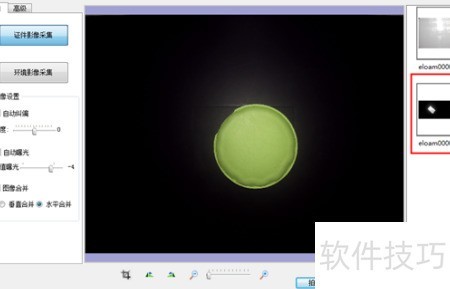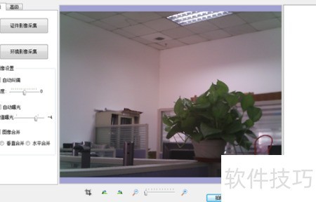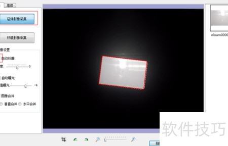 7、 进入证件影像采集界面,主摄像头开启预览,勾选纠偏功能,画面中将显示红色边框,点击拍照按钮,右侧即呈现纠偏处理后的照片,可选择自动曝光或手动调节定值曝光参数。