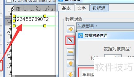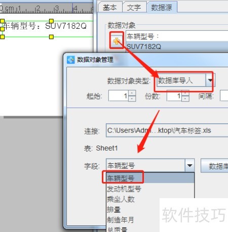 3、 接下来需在汽车标签上添加相关信息。通过条码标签打印软件中的绘制普通文本功能插入文本内容,进入其图形属性中的数据源设置,将默认数据修改为手动输入车辆型号:,随后点击左侧的+号,新增一条数据,选择从数据库导入,连接Excel表格,从中提取并导入对应的车辆型号信息,完成数据绑定。