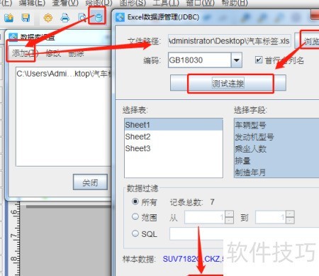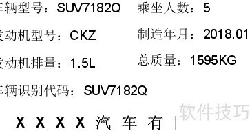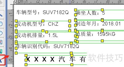 4、 在汽车标签中添加若干普通文本,通过手动输入和数据库导入两种方式,依次录入发动机型号、核载人数、排量、生产日期、总质量及车辆识别代号,并手动添加XXXX汽车有限公司字样。