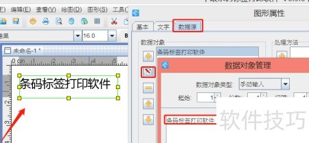 4、 在软件左侧点击实心A按钮,于画布上创建文本对象。双击该文本进入编辑模式,在图形属性的数据源栏目中点击修改,清除默认内容后手动输入所需信息,并确认保存。若需调整字体、大小、对齐方式等样式设置,可参照相关文字添加教程进行操作。