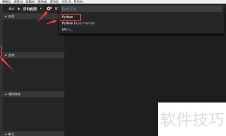 5、 点击左侧调试按钮,进入调试页面后选择齿轮图标,配置或修复时在环境选项中选python。