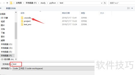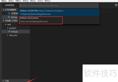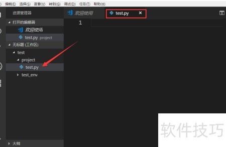 3、 添加文件夹后所示,在test目录下包含project项目文件夹和用于Python虚拟环境的test_env。在project文件夹内新建一个名为test.py的Python文件并打开。此时,VS Code会自动检测文件类型,并在左下角显示当前使用的Python运行环境,方便确认配置是否正确。