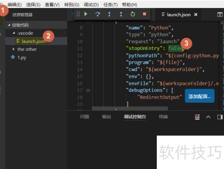 8、 进入.vscode文件夹,打开launch.json文件,把stopOnEntry的值从true修改为false,然后按Ctrl+S保存更改后的配置。
