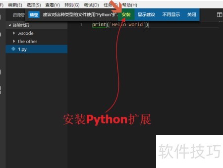 2、 当VS Code检测到Python文件时,会提示安装Python扩展,只需点击安装即可完成配置。