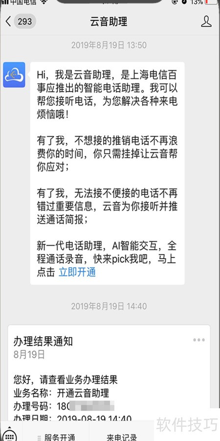 1、 进入云音助理公众号,点击底部菜单中的服务开通选项即可办理。