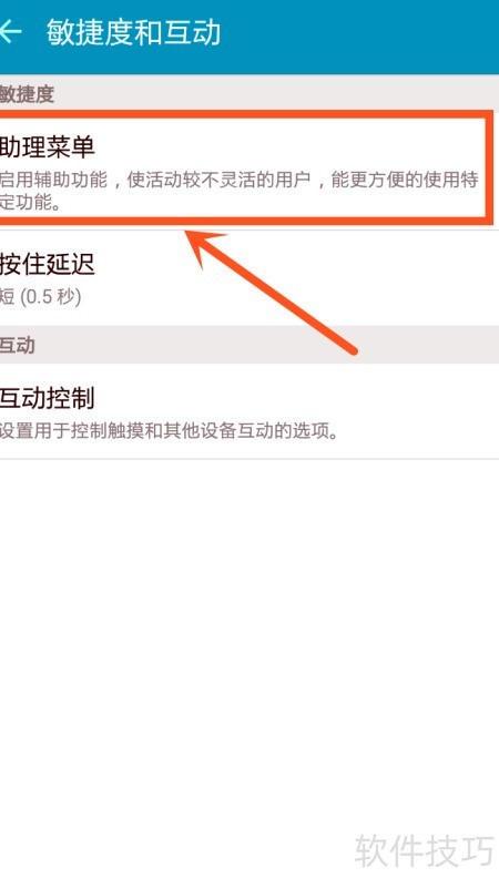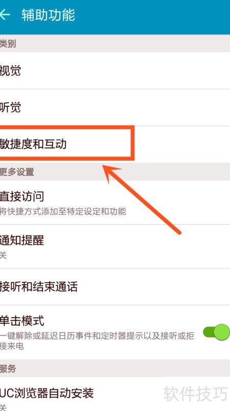 3、 开启辅助功能,进入敏捷度与互动设置,操作所示。