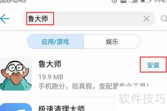 2、 在安卓应用商店搜索鲁大师,找到后点击安装即可。