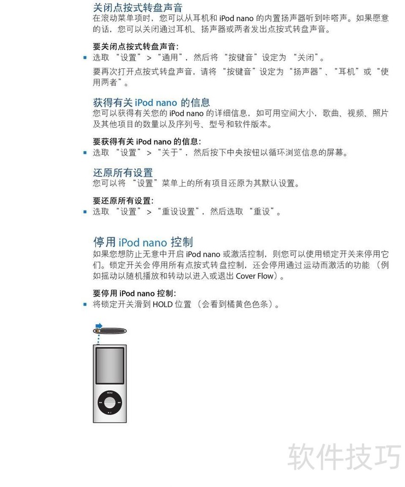 、 本文是Apple苹果iPod Nano音乐播放器使用说明书,详细讲解产品操作方法及常见问题的解决措施,帮助用户更好地使用设备。