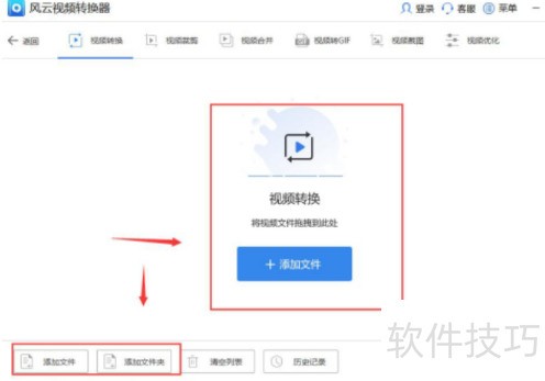 6、 点击视频转换进入操作界面,中间位置点击添加文件导入需转换的视频。若需批量导入,可选择左下方的添加文件夹功能,快速添加整个文件夹中的视频内容。