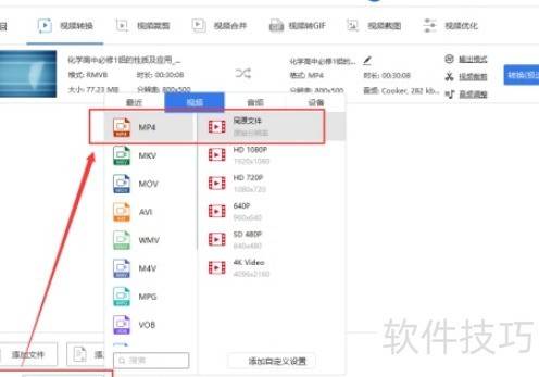 7、 选择输出格式为MP4,将FLV文件转换为MP4格式即可完成设置。