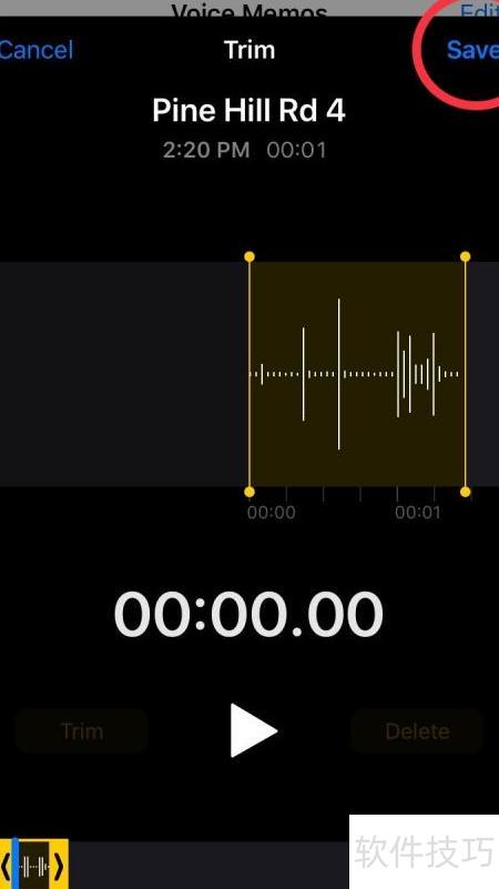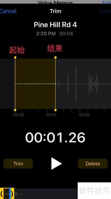5、 调整音频文件中两条黄色竖线的位置,分别作为起始和结束标记,框选需处理的区域。软件提供两种操作:Trim功能保留两线之间的部分,删除其余内容;Delete功能则相反,清除两线区间内的音频,保留外部部分。根据需要选择合适方式完成编辑。