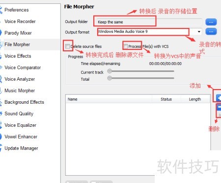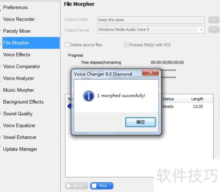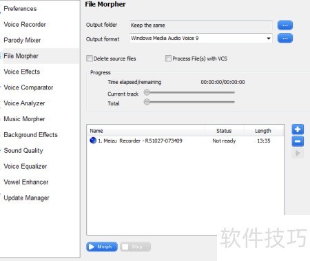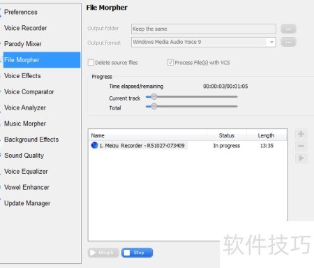 5、 文件添加后,务必勾选使用VCS处理文件选项,否则变声完成后将无法应用系统中选定的声音。设置完毕后,点击morph按钮,程序即开始进行音频转换,处理过程自动进行,无需其他操作。