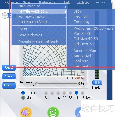 2、 将鼠标悬停在Nickvoice菜单上,点击展开下拉选项,其中包含多种声音类型。将指针移至所需音效并单击,即可完成声音的切换与设置。