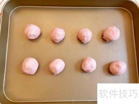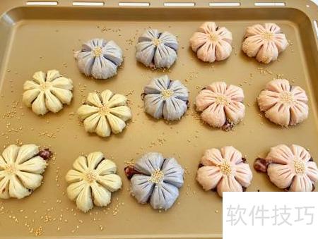 9、 将整形好的花酥胚底部裹上白芝麻,摆入烤盘。