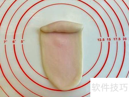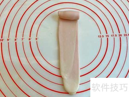 4、 将醒发好的油皮压扁,包入油酥后揉圆,用擀面杖擀成牛舌状,再卷起即可。