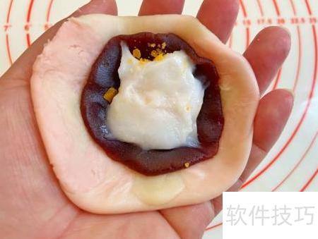 3、 将豆沙每份15克搓圆压扁,铺上麻薯与咸蛋黄碎,覆膜待用。