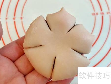 7、 将包好的生胚压平,切出五瓣但中间相连,再用手捏出花瓣形状。