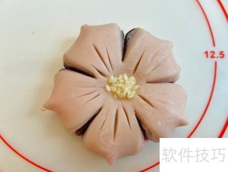 8、 将中间花型稍压扁,用刀刻出花瓣纹理,花蕊处刷上蛋液,再撒上芝麻。
