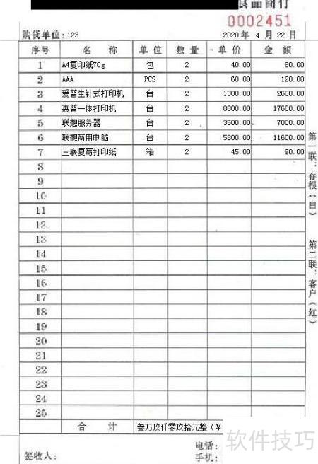 4、 纸张尺寸的选择通常根据单据所包含的商品内容多少来确定。若商品种类较多,需选用较大尺寸的纸张;内容较少时,则可选择较小规格。常见的三等分纸适用于商品种类在6种以内的单据;二等分纸适合商品行数不超过12行的情况,这种尺寸与普通机打发票相近,因此不少客户在描述打印纸大小时会直接说和发票一样大。而当商品项目繁多时,整张纸更为合适。例如一位从事食品批发的客户,主要供货给小型超市,每次配送的商品多达二三十种,为此他选用了整张一式四联的打印纸,以满足信息完整呈现的需求。