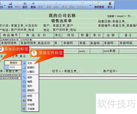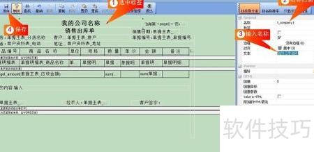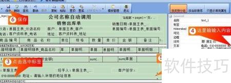 3、 第二步:若需更改公司名称,打开模板设计,选中公司名称标签,在右侧文本框输入新名称,并在第一行标签名称后添加数字1,具体操作所示。
