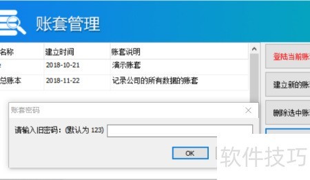 3、 新建账套后,系统会自动将其添加到账套管理列表中,便于后续操作。用户可登录、修改或删除账套。如需调整信息,点击修改账套密码即可完成设置。账套密码用于保护数据安全,删除时必须输入正确密码,否则无法执行删除操作,有效防止未经授权的更改与删除,最大程度保障账套的安全性与稳定性。