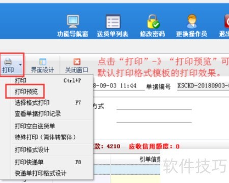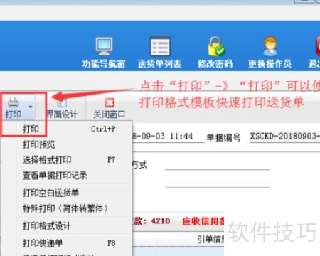 5、 在送货单界面工具栏选择打印,再点打印格式设计,即可进入打印格式设计窗口。
